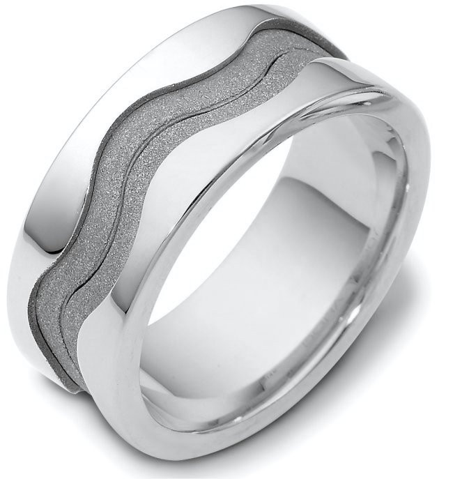 Sterling silver, 9.0 mm wide , comfort fit unique wedding band. The center of the band has a coarse and heavy sandblast matte finish. The outer edges are polished. Different finishes may be selected or specified.