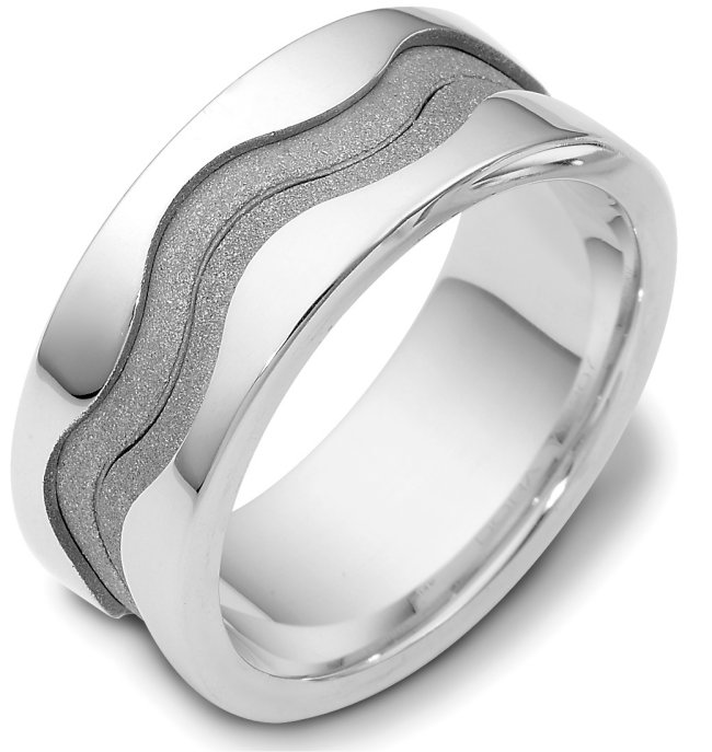 One 18 K white gold, 9.0 mm wide , comfort fit unique wedding band. The center of the band has a coarse and heavy sandblast matte finish. The outer edges are polished. Different finishes may be selected or specified.