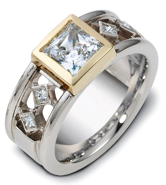 18K two tone ring, 8.0 mm wide comfort fit with 4 princess cut diamonds 0.14 ct total weight. Diamonds are graded as VS in clarity G-H in color. Center diamond can be from 0.75ct to 1.25 ct. Center diamond is not included in this price. The yellow gold bezel around the center stone has a matte finish. The rest of the ring is polished. Different finishes may be selected or specified.
