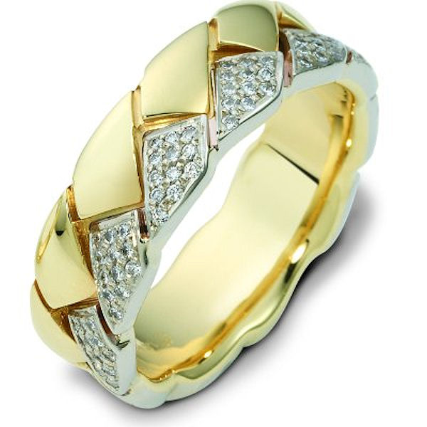 18 K white and yellow gold 7.5 mm wide, comfort fit, diamond wedding band. Diamonds total weight in size 7.0 is approximately 0.60 ct. The diamonds are graded as VS1-2 in clarity G-H in color. The finish is polished. Different finishes may be selected or specified.
