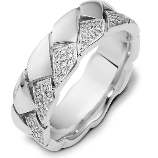 18 K white gold 7.5 mm wide, comfort fit, diamond wedding band. Diamonds total weight in size 7.0 is approximately 0.60 ct. The diamonds are graded as VS1-2 in clarity G-H in color. The finish is polished. Different finishes may be selected or specified.