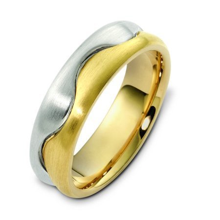 14K white and yellow gold, 6.5 mm wide, comfort fit, wedding band. The finish is brushed. Different finishes may be selected or specified.