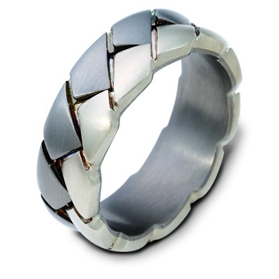 14 kt white gold and titanium , comfort fit, 8.0 mm wide wedding band. The finish is brushed. Different finishes may be selected or specified.