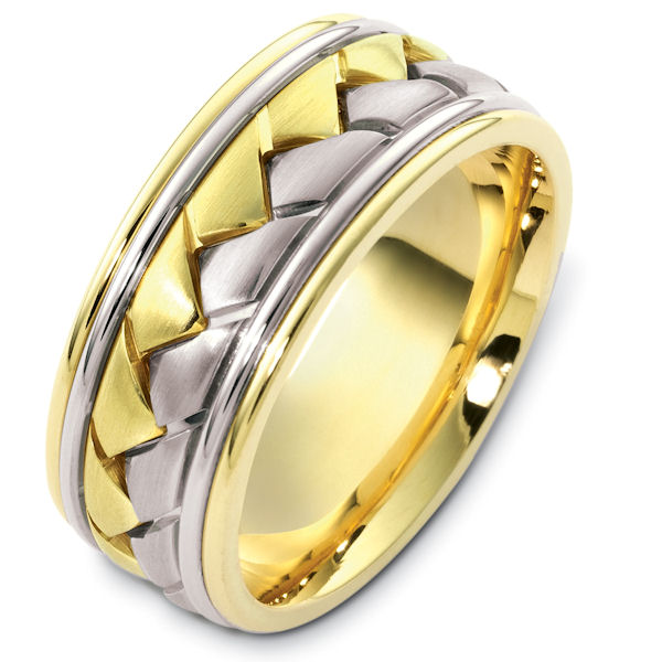 14 kt two-tone gold, braided, comfort fit, 9.0 mm wide wedding band. The braided portion is a brush finish. The outer edges are polished. Different finishes may be selected or specified.
