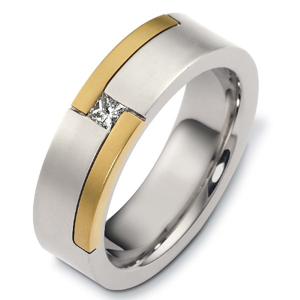18Ktwo- tone gold, 6.5 mm wide, comfort fit, 0.18ct princess cut diamond ring. Diamond is graded as VS1 in clarity G-H in color. The yellow gold portion of the band has a polished finish and the white gold is matte. Different finishes may be selected or specified.