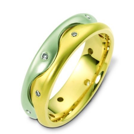 14K white and yellow gold, 6.5 mm wide, comfort fit, diamond wedding band. The band holds 10 round brilliant cut diamond with total weight of 0.15 ct. The diamonds are graded as VS1-2 in clarity G-H in color. The finish is matte. Different finishes may be selected or specified.