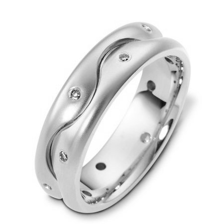 14K white gold, 6.5 mm wide, comfort fit, diamond wedding band. The band holds 10 round brilliant cut diamond with total weight of 0.15 ct. The diamonds are graded as VS1-2 in clarity G-H in color. The finish is matte. Different finishes may be selected or specified.