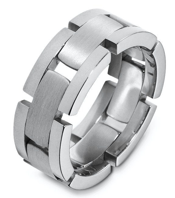 18K white gold, 8.0 mm wide, comfort fit, wedding band. Links are flexible. The finish in the center of the ring is brushed and the outer edges are polished. Different finishes may be selected or specified.
