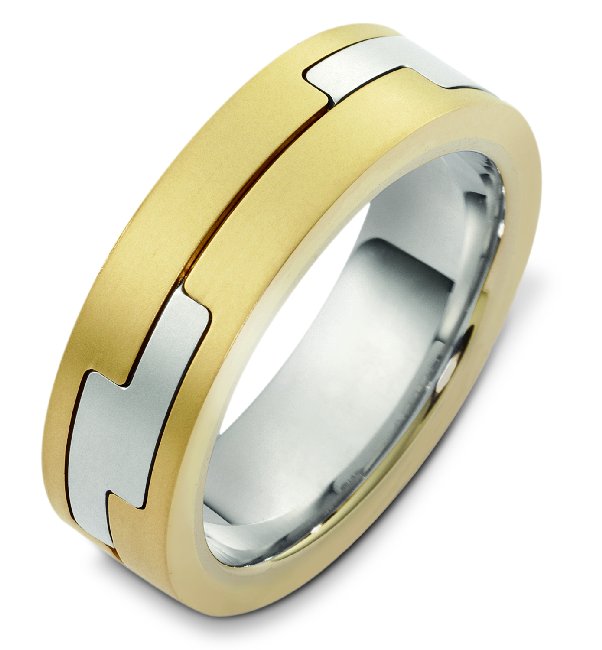 14K two-tone gold, comfort fit, 7.0 mm wide wedding band. The white gold parts in the band are polished and the yellow gold is matte. Different finishes may be selected or specified.