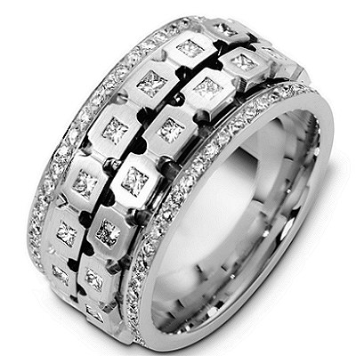 14K white gold, 12 mm wide and 2.6 mm thick, Spinning comfort fit diamond eternity ring. Diamonds in the center parts are rotating independetly of each other. Diamond approximate total weight is 1.75 ct. in size 6.0. Diamonds are graded as VS1 in clarity G-H in color. The finish is matte. Different finishes may be selected or specified.