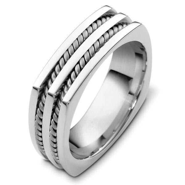 18K White gold 7.0 mm wide comfort fit wedding band. There are two hand made ropes inlayed in the band. The finish on the ring is polished. Different finishes may be selected or specified.