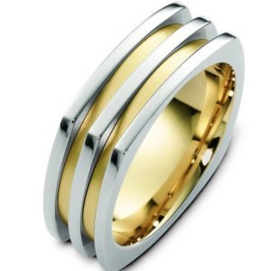 14K two-tone gold, comfort fit, 7.5 mm wide wedding band. The yellow gold portions of the ring are matte and the white gold portions are polished. Different finishes may be selected or specified.