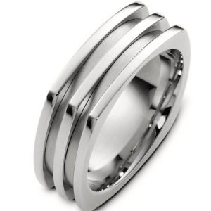 14K white gold, comfort fit, 7.5 mm wide wedding band. The two lower bands inlayed in the ring have a matte finish and the rest of the band is polished. Different finishes may be selected or specified.