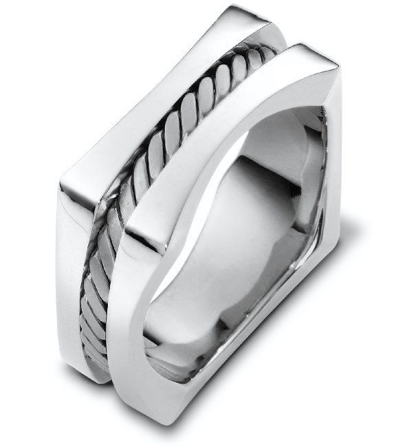 Sterling silver, 9.0 mm wide comfort fit wedding band. There is one handmade rope in the center with a brush finish. The outer edges are polished. Different finishes may be selected or specified.