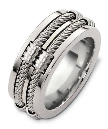 Sterling Silver, 9.50mm wide, 4mm thick, handmade, comfort fit wedding band. There are two hand made ropes in the band. The finish on the ring is matte. Other finishes may be selected or specified.