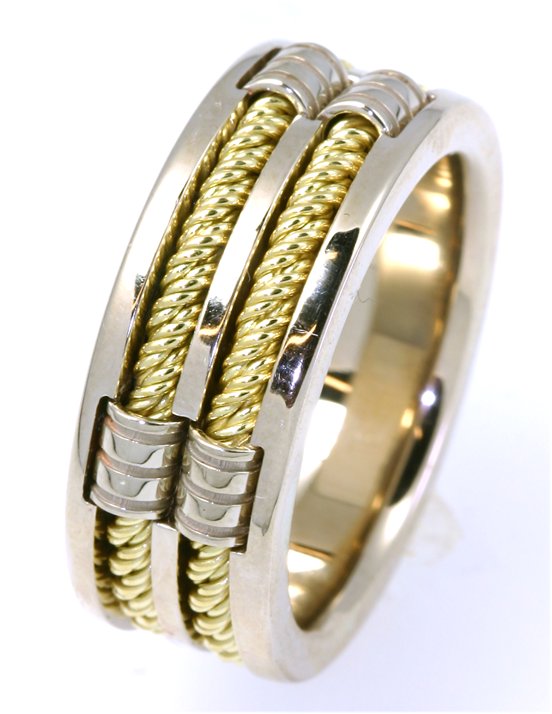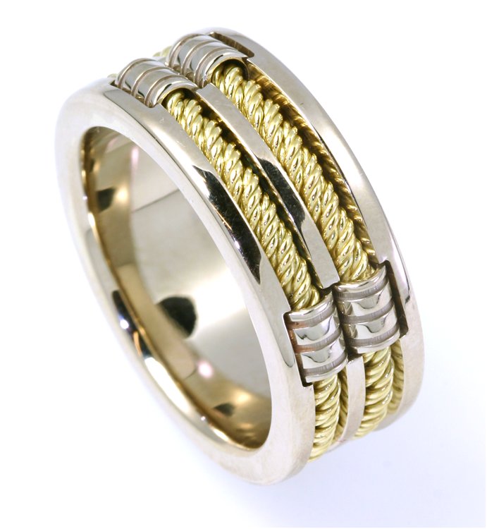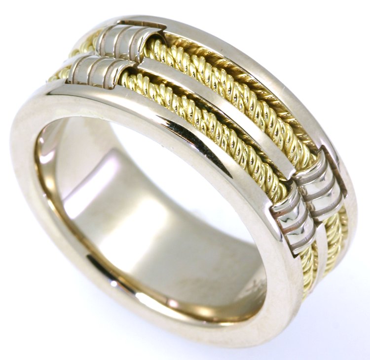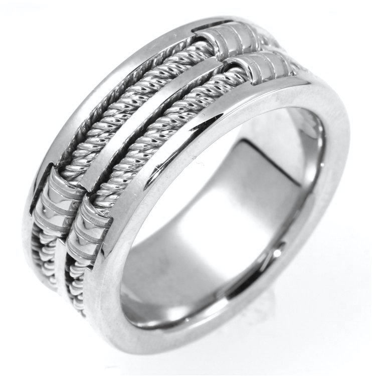 14 K white gold, 9.50mm wide, 4mm thick, handmade, comfort fit wedding band. The finish on the hand made cable ropes are matte and the rest of the ring is polished. Different finishes may be selected or specified.