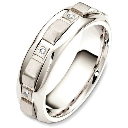 Palladium, 7.0 mm wide, comfort fit diamond wedding band with a contemporary design. There are 8 diamonds around the band for a total weight of 0.08ct. The diamonds are graded as VS in clarity and G-H in color. The center rotating portion is a matte finish and the outer edges are polished. Different finishes may be selected or specified.