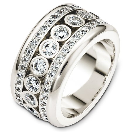 18 Kt White gold and diamond wedding band, 11.5 mm wide, comfort fit band. This eternity band holds 2.33 ct tw diamonds, VS in clarity and G-H in color. The ring has 13 diamonds in the center. The center diamonds are floating (moving) within the band. The finish is polished. Different finishes may be selected or specified.
