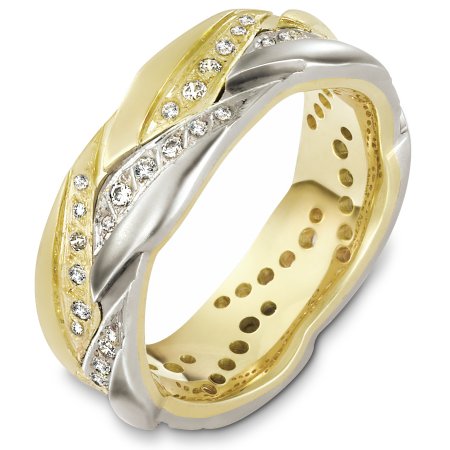 18 Kt Two-tone and diamond wedding band, 8.0 mm wide, comfort fit band. The band has 0.50 ct tw diamonds, VS in clarity and GH in color. The finish is matte. Different finishes may be selected or specified.