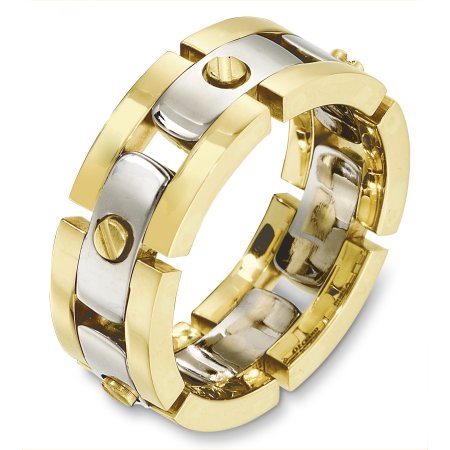 14 Kt Two-tone wedding band, 8.5 mm wide, comfort fit band. The links are flexible. The finish for the center of the ring is brushed and the outer edges are polished. Different finishes may be selected or specified.