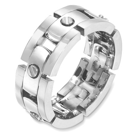 18 Kt White gold wedding band, 8.5 mm wide, comfort fit band. The links are flexible. The finish for the center of the ring is brushed and the outer edges are polished. Different finishes may be selected or specified.