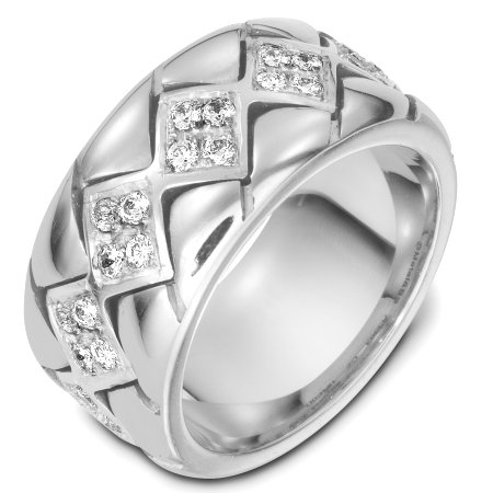 18 Kt White gold and diamond wedding band, 10.0 mm wide, comfort fit band. This holds 0.70 ct tw diamonds, VS1 in clarity and GH in color. The finish on the ring is matte. Different finishes may be selected or specified.
