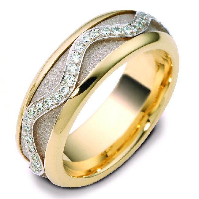 18K two-tone, 7.0mm wide, comfort fit diamond wedding band. the center part is rotating. Diamond total weight is 0.30ct in size 6.0. The diamonds are graded as VS in Clarity and G-H in color.