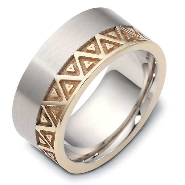 18 K white and yellow gold, 10.0 mm wide, comfort fit, carved wedding band. The finish in the grooves are a coarse sandblast finish and the rest of the band is brushed. Different finishes may be selected or specified.