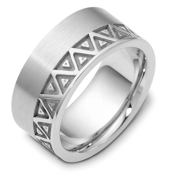 14 K white gold, 10.0 mm wide, comfort fit, carved wedding band. The finish in the grooves are a coarse sandblast finish and the rest of the band is brushed. Different finishes may be selected or specified.