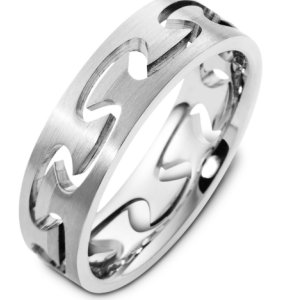 18K white gold, comfort fit, 6.0 mm wide wedding bands. The bands are separated and hold together by design. The finish on the ring is brushed. Different finishes may be selected or specified.