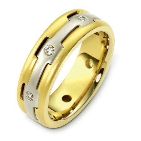 14 Kt Two-tone and diamond wedding band, 7.5 mm wide, comfort fit band. This holds 0.32 ct tw diamonds, VS1 in clarity and GH in color. The finish on the ring is matte. Different finishes may be selected or specified.