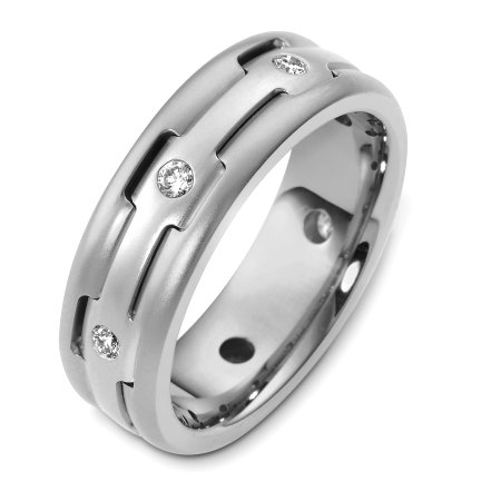 14 Kt White gold and diamond wedding band, 7.5 mm wide, comfort fit band. This holds 0.32 ct tw diamonds, VS1 in clarity and GH in color. The finish on the ring is matte. Different finishes may be selected or specified.