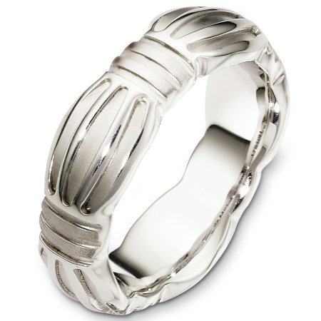 14 Kt White gold wedding band, 7.0 mm wide, comfort fit band. The finish on the ring is a mix of matte and polished. Different finishes may be selected or specified.