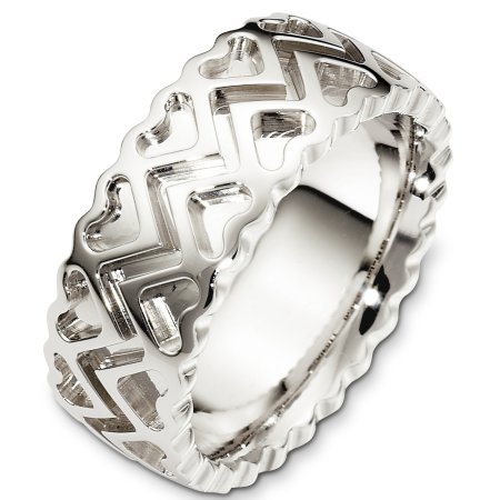 18 Kt White gold wedding band, 8.0 mm wide, comfort fit wedding band. The band includes hearts carved in the wedding band. The finish on the ring is polished. Different finishes may be selected or specified.