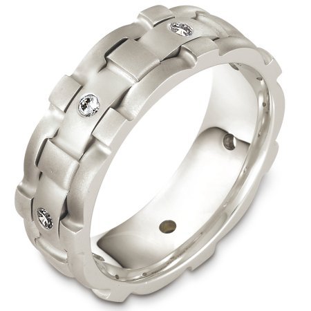 14 Kt White gold and diamond wedding band, 7.5 mm wide, comfort fit band. There are seven diamonds weighing 0.245 ct tw, VS1 in clarity and GH in color. The finish on the ring is matte. Different finishes may be selected or specified.