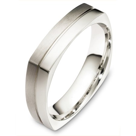 14 Kt White gold wedding band, 5.0 mm wide, comfort fit band. The band is squared shape and the edges are rounded to give a comfort fit feel. Half the band is a matte finish and the other half is a polished finish. Different finishes may be selected or specified.