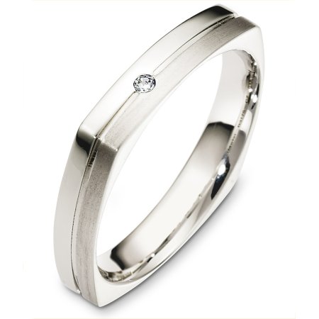 18 Kt White gold and diamond wedding band, 4.0 mm wide, comfort fit band. This holds 0.05 ct diamond, VS1 in clarity and GH in color. Half the band is a matte finish and the other half is a polished finish. Different finishes may be selected or specified.