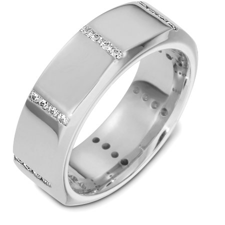 14 Kt White gold and diamond wedding band, 8.0 mm wide, comfort fit band. The band is octagonal shape with diamonds set on each corner. It holds 0.35 ct tw diamonds, VS1 in clarity and GH in color. The finish is matte. Different finishes may be selected or specified.