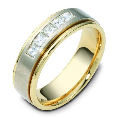 18K two-tone 6.5 mm wide, 0.60 ct total weight, diamond ring. Diamonds are VS1 in Clarity G-H in color. The center finish is brushed and the outer edges are polished. Different finishes may be selected or specified.