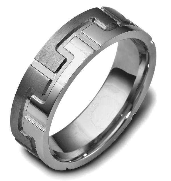 Titanium contemporary carved, comfort fit, 6.5mm wide wedding band. The ring is carved with a mix of matte and polish finish. It is 6.5mm wide and comfort fit. Different finishes may be selected or specified.