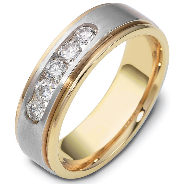 18K and platinum two-tone, comfort fit, 7.0 mm wide diamond wedding band. Diamonds total weight is approximately 0.50ct. The diamonds are graded as VS in clarity G-H in color. The finish in the center is matte and the outer edges are polished. Different finishes may be selected or specified.