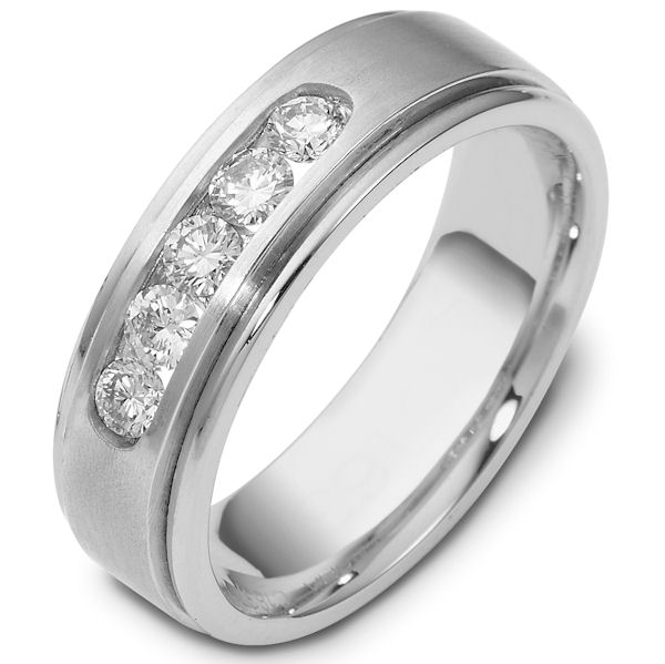 18Kwhite gold,, comfort fit, 7.0 mm wide diamond wedding band. Diamonds total weight is approximately 0.50ct. The diamonds are graded as VS in clarity G-H in color. The finish in the center is matte and the outer edges are polished. Different finishes may be selected or specified.