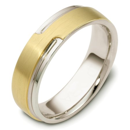 14 Kt Two-tone wedding band, 6.0 mm wide, comfort fit wedding band. The band can also be made with the gold colors reversed. Please state that in the comments section. The raised portion of the ring is a brushed finish and the rest is polished. Different finishes may be selected or specified.