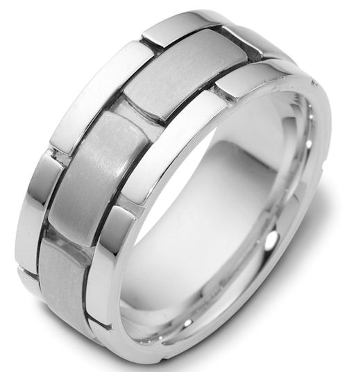 18K white gold, 9.0 mm wide, comfort fit wedding band. The center of the ring is brushed and the outer edges are polished. Different finishes may be selected or specified.