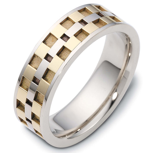 14 Kt Two-tone wedding band, 7.0 mm wide, comfort fit wedding band. The grooves are a sandblast coarse finish and the rest is polished. Different finishes may be selected or specified.