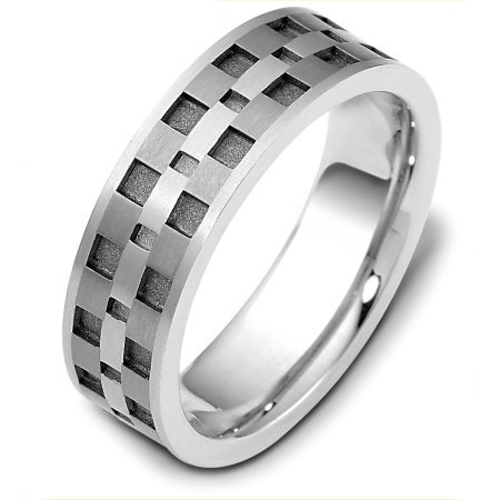 Titanium and 18 Kt white gold wedding band, 7.0 mm wide, comfort fit wedding band. The grooves are a sandblast coarse finish and the rest is polished. Different finishes may be selected or specified.