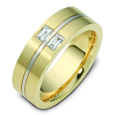 18K white and yellow gold two tone, 7.5 mm wide, comfort fit diamond wedding band. The band has two baguette cut diamonds with total weight 0.40 ct. The diamonds are graded as VS1 in clarity G in color. The finish on the ring is matte. Different finishes may be selected or specified.