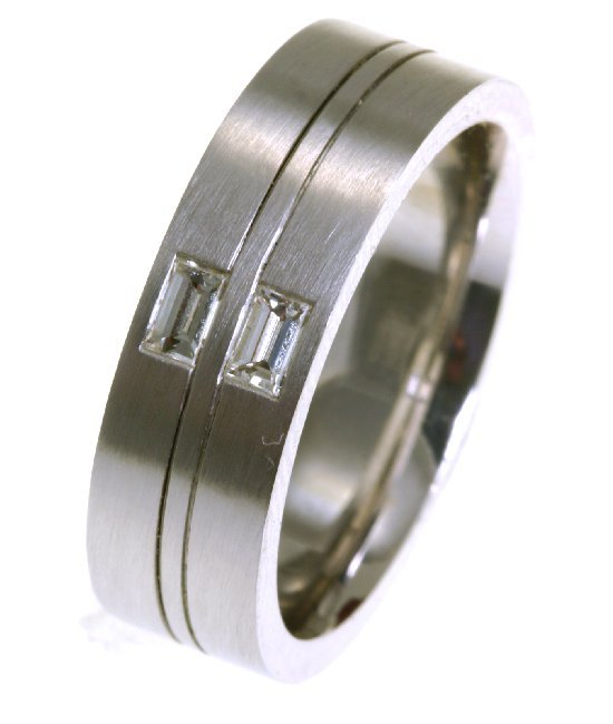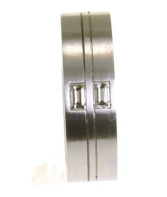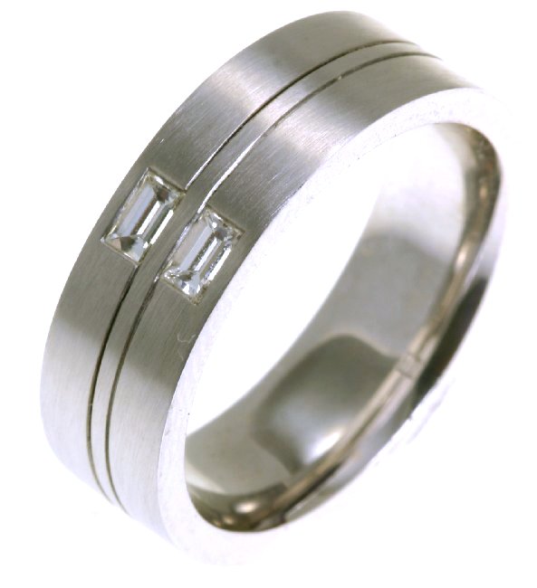 18K white gold, 7.5 mm wide, comfort fit diamond wedding band. The band has two baguette cut diamonds with total weight 0.40 ct. The diamonds are graded as VS1 in clarity G in color. The finish on the ring is matte. Different finishes may be selected or specified.