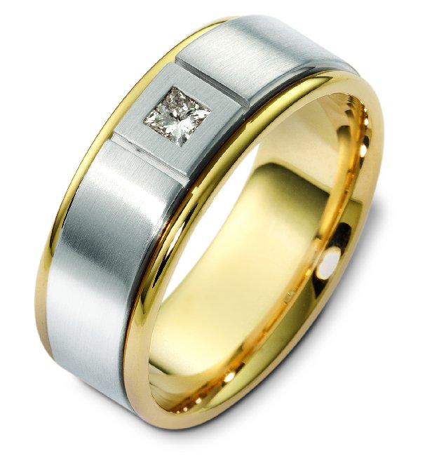 14K two-tone gold,comfort fit, 8.0 mm wide, diamond wedding band. The wedding band holds one princess cut diamond that weighs 0.16 ct and graded as VS in clarity G-H in color. The finish in the center is matte and the outer edges are polished. Different finishes may be selected or specified.
