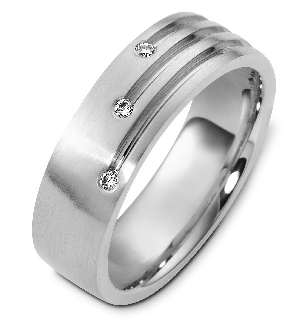 18K white gold, comfort fit 6.5 mm wide, diamond wedding band. Diamonds total weight is 0.09 ct and the diamonds are graded as VS1-2 in clarity G-H in color. The ring is a brushed finish. Other finishes may be selected or requested.